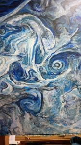 From 7 years ago. Acrylic on canvas. This was based on a photo taken by NASAs Juno probe of the South pole of Jupiter showing massive blue storms. I’d forgotten about it. This was when I still had an art studio, and my hubby was alive. Good memories, I hope people remember my art when I gone.