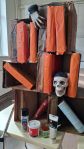 Hours of work. Today I finished painting the back of the bookcase to turn it into a rock that goes in front of a creepy cave…. My friend covered the spell books and added the skull and hand to the bookcase side. .