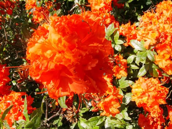 Bright flowers, photo taken six years ago. I think it’s a rhododendron, glowing like an orange sun. Talk about flower power. I’m not going to try and duplicate or mirror this photo because it’s really stand alone.