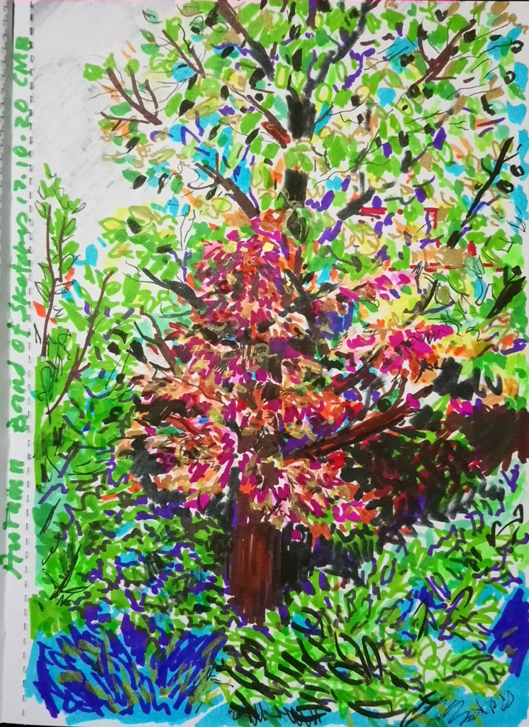 I just drew this, it started to get dark but it’s our little acer tree under the Walnut tree, also willow branches, Holly and buddlea.. The view is out of our side window at the top of the stairs. The acer turns deep red and orange and the walnut is starting to go yellow. The Holly is deep green but by the time I got to it, it was going really dark so that part was drawn even more quickly than the rest. This was for our #bandofsketchers prompt today ‘autumn’ the buddlea was also quickly sketched.