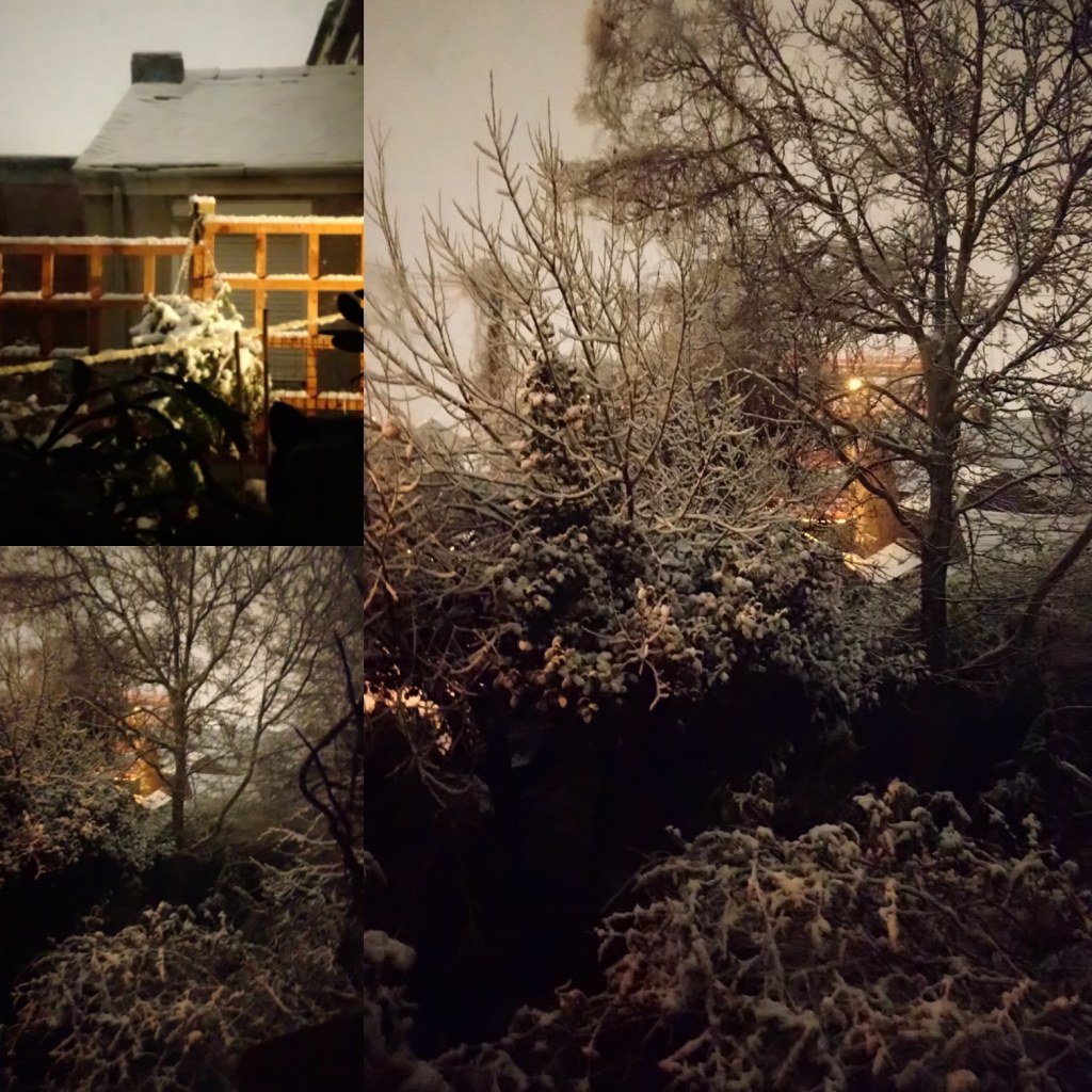 As our street lamps change from sodium light to white led lamps I wonder if that orange glow will fade and we will get silvery white instead? The sound is deafened by the snow, everything is muffled. I think I can hear sleighbells…..