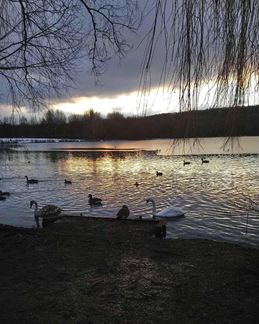 There was ice on Westport lakes and ducks were standing round on it while the geese and swans swam in the open water. The light was glancing across the surface as it headed down towards sunset. There was scattered cloud that gave the scene light and shade. All in all very picturesque for a short cold walk round the lakes.