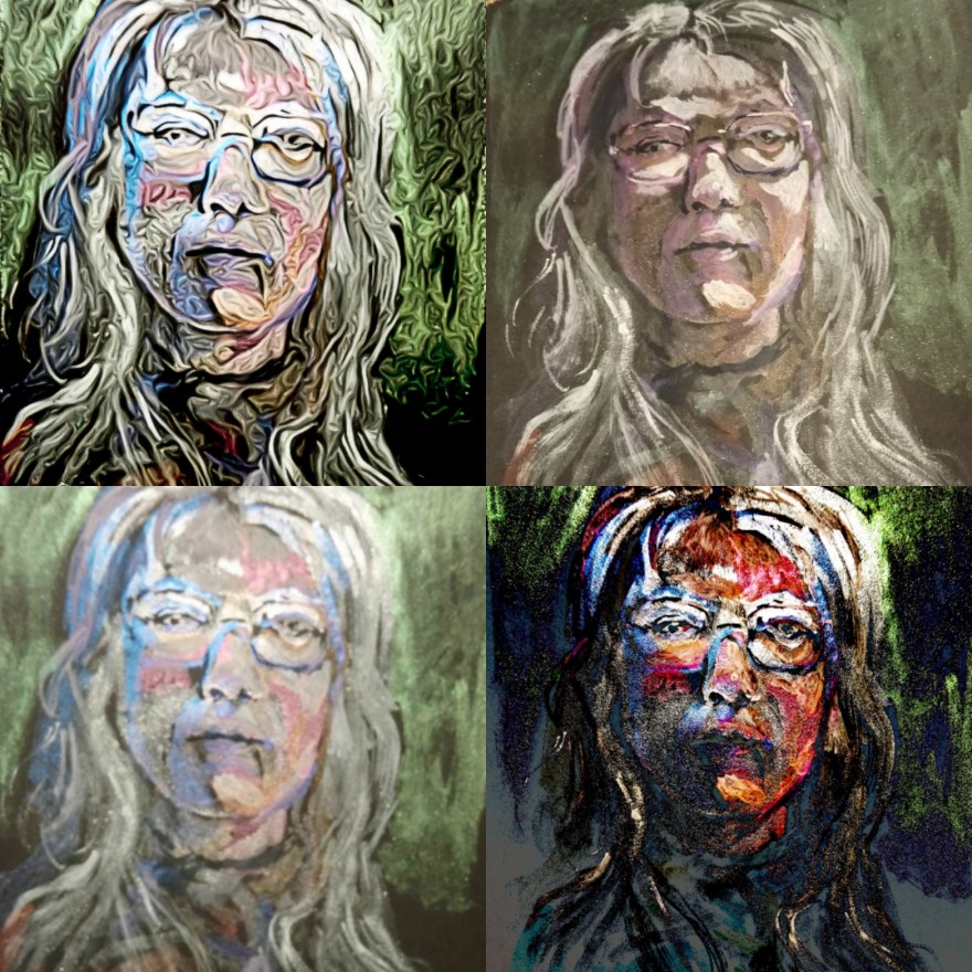 Self portrait at 60, playing with metallic watercolours and then digitally adjusted.