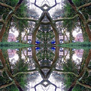 Turning a tree into a bug… Photograph of a tree last week, I decided to mirror it in four sections. I deliberately centered on the blue in the background which I also think gives a feeling of a stained glass window.