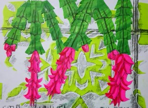 Today’s #bandofsketchers prompt was organic shapes. I had drew a pot with a tile pattern using cut outs from post it notes and shaded with graphite. Then I coloured in green post it notes with dark green felt pen and cut out shapes. I then cut out pink Christmas cactus flower shapes and added felt pen to those too.