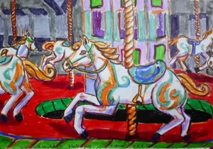 I could have drawn a beach, but a strong memory from my childhood was riding on the gallopers (merry go round). I have no idea where it was. We probably went for a trip on a steam train. I think the memory is strong because of the bright colours.