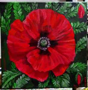 This was from 2019, it was a Poppy that lacked definition, it was a bit dark and flat. I was never very happy with the leaves so I over painted them too. Acrylic on canvas.