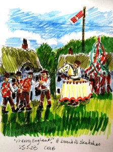 Today’s #bandofsketchers prompt was English. I think I went full “merry England” here! It’s definitely not fine art, more of a doodle, with morris dancers (you could have ‘molly’ dancers)… and a hobby horse, and children in the background dancing round the maypole, it’s set in a village with thatched cottages. I guess the main place I can think of that does something like this is Abbots Bromley near Rugeley in Staffordshire. They have the Abbots Bromley Horn Dance. But that’s in September? Sadly I’ve never witnessed it!