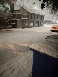 Snow is falling. The road is covered by it and since we live on a steep hill cars are coming up but doing three point turns because of it. I’ve seen at least 5 reversing lights through the front door window so far tonight. I think it was gritted during the initial snow fall, but they haven’t come back and it’s 11.45pm now.