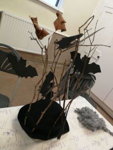 We are recreating the Mystery Play we put on in July, but as a bigger production. One scene has bats causing mayhem so my friend created this. They will also have bat shaped cloaks and we have a backcloth with skeletal trees and a witch flying in front of the moon. One lot of scenery done, about 8 more scenes to do!