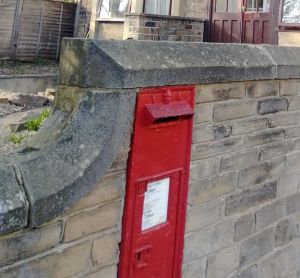 Postboxes are made of cast iron. They are traditionally painted red, but recently have been painted gold in towns where sports people won gold medals at recent Olympics. I like this box that had been put into a stone wall.