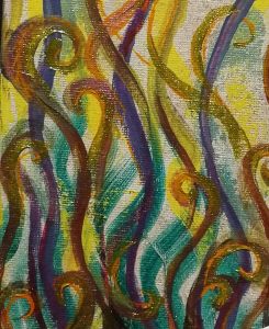 Making fire with spirals, snaking up onto the sky. Green and orange for definition. Locking up in circles and curves of acrylic on canvas, part of a work in progress.