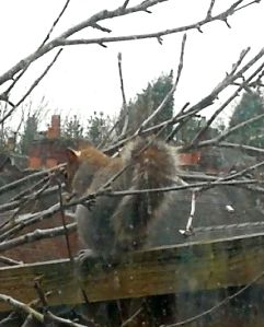 Squirrel with bushy tail on my garden fence yesterday. Looking in the wrong direction, the squirrel had probably retrieved a walnut that it had cached in my plant pots in autumn. The tree he is sitting “in” is my apple tree which was laden with fruit last autumn.