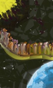 But talking about it I remembered doing a collage with ripped up magazine pages. The Earth is at the bottom, a ribbon comes up off the Earth and has a queue or line of people moving up away into space. I can’t remember if they were heading towards the sun or the moon. I think the collage was in landscape mode but my digital canvas is orientated in portrait mode. I’m not sure whether the population had hit 4 or 6 billion… Now it’s over 8 billion. We are like a virus taking over the world….