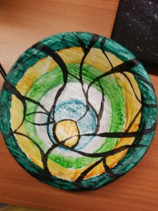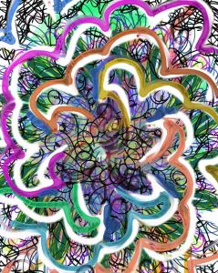 She put her art therapy head on and felt it could represent emotions wanting to escape, perhaps bottled up anger. Certainly it looks a bit like a Catherine wheel. I think the outer part looks like flames. It’s not calm. It’s expressive, but also chaotic. Felt good to paint it. X