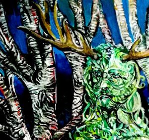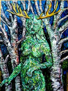 Commissioned acrylic on canvas. A surreal abstracted spirit : Green woman. With antlers adoring her head. It’s taken months to finish because I shake even though it’s only about A4 size. I imagine her standing in a grotto of trees, hidden from mortal view. She is nature, watching carefully as the land changes through time. She fights for the natural world and environment.