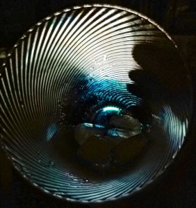 Photo of a drinking glass, it has a ridged blue surface spiralling round the outside. I took this photo looking through it at the TV screen in a darkened room. The curves on the right hand side are my fingers and fingernails. There are pieces of ice at the bottom of the glass. I might put it through apps to see how it comes out.