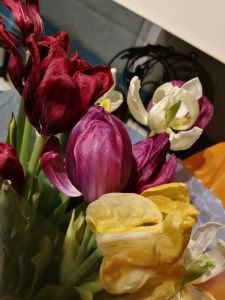 Sad tulips, they’ve almost wilted. The result is an almost abstract mix of colours, like impasto oil paints, starting to merge and mingle.