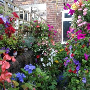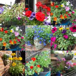 I managed to step down a four inch step at the backdoor with hubbys help. Took photos of the hanging baskets before autumn starts to chill them…