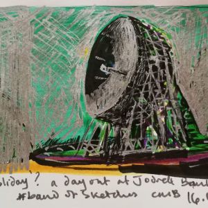 Old drawing of Jodrell Bank radio telescope, takes tons of metal to prop the dish up….previously used for a different band of sketchers prompt ‘holiday ‘ but it seemed appropriate. Cheshire, near Holmes Chapel,