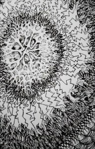I don’t know what I was doing but this emerged today. It looks like a slice through some tissue. Maybe animal or vegetable. I kept doing lay ers of pattern. A line of the drawing had to stick to rules that I set for myself, like a curve every few centimeters or a wobbly line, so that some areas are lighter and less marked than others. It actually drawn on the back of the bird doodle I drew yesterday. I could see where the ink was showing through, but then I decided to extend it further. This was the result.