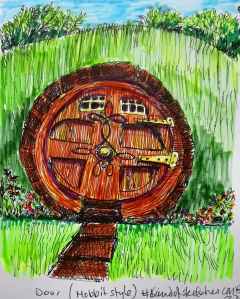 Tuesdays #bandofsketchers prompt was door. So I drew a hobbit style door to cheer myself up. Felt pen and black ink fine line pen. The door would be solid oak and a neat flower bed would be planted on either side of it. I love the story the Lord of the Rings, I’m not sure about the films, but I have a set of cassette tapes that have the Lord of the Rings radio series that was broadcast by the BBC in about 2000?