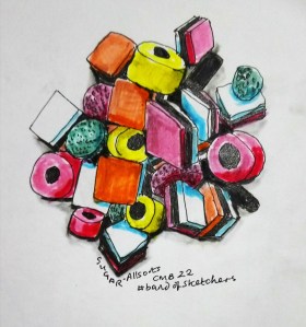 Tuesdays #bandofsketchers prompt was Sugar. I could have drawn granulated sugar, but I chose to draw liquorice allsorts. They were my favourite sweets. I would peel them apart, eat the sweet stuff first then finish it with the liquorice afterwards. Felt pen drawing and black fine ink liner pen.