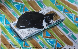Today’s #bandofsketchers prompt was cornering. Cat covering a book covering a mat covering our floor…. He likes to keep his paws warm. Funny how they find the warmest places despite having fur! Felt pen and black ink drawing.