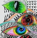 A felt pen and black ink doodle/sketch of different eyes. I found it hard to blend the colours of the pens because they dry quickly so you have to try and shade in thin layers and build them up. It’s only a small drawing and blowing it up a bit really shows up the blotchiness. Mind you when I paint I do find it hard to blend colours. I think that’s because I use acrylics which dry very fast as opposed to oils that can take a very long time to dry. I don’t do photorealism but I once had the local newspaper art critic talk about one of my paintings in his report about a local exhibition. He said if I wanted to be a photo realist I should try harder! I was insulted because a) I was not trying to be one and b) he didn’t ask me what my style was! I think it was lazy journalism. Filling up a couple of lines. But he didn’t see how much it upset me. And I still feel it, even years later!