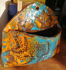 This is the planting pocket I made at BArts pottery project a few weeks ago. It was made with rolled out terracotta clay and coloured with bright slip. I used plants to impress patterns into it’s surface. It looked OK, but the colours intensified during firing. I think they are almost too bright. I hope when it has soil and a plant in it, it will look nicer. X