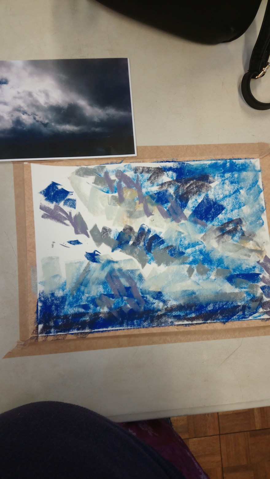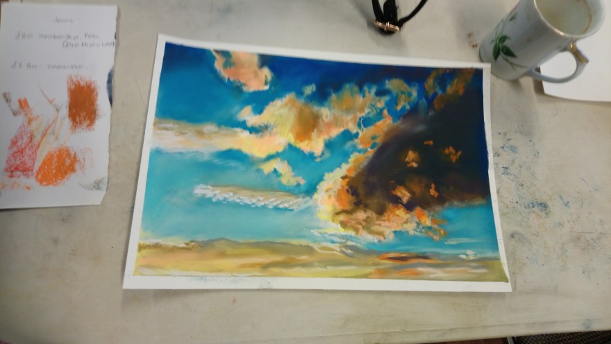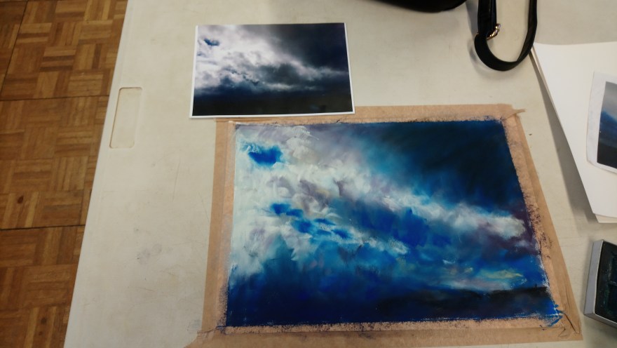 It’s difficult to describe what we learnt, it was complicated. I’ve added a few photos of the two pictures I did. First you lay down colours in soft pastel on fine toothed pastel paper. Once you have enough pastel on you blend them together, then build up layers using smaller more intricate marks, gradually blending and adding. Sometimes only lightly pressing on the pastel, other times blending more. The direction of the marks can make a difference to how it looks. You can use the edge of your hands, your palms, your fingers or blending tools (like a brush but with the bristles replaced with a rubber tip).