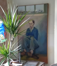 It was summer in 1981, I was on holiday from college. I wanted to paint my then boyfriend, later husband. I had oil paints but no canvas, so I got an old wooden door. I carved and sanded it a bit to make it more interesting. We were living in a shared house and the curtains were in our living room. I remember they were bright yellow. I love this painting, it brings back great memories.