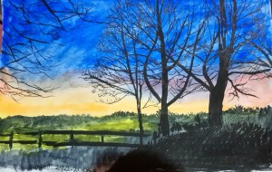 Quick watercolour and ink pen sketch of the sunset on my walk today. It took me 3. 5 hours to walk 6.73 miles, but that was including stops and visits to shops. I’m haven’t blogged much today.. Too tired…