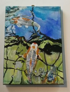 A friend now has this painting of Koi carp swimming at a pool in a garden centre I did a few years ago. Perhaps I will have to do more wobbly paintings now I have Parkinsons disease. I hate the thought I might not be able to paint. Someone asked me today what I was going to do if I don’t paint. I don’t know. It’s always been part of me. I know my manual dexterity is deminishing. I hope something can be done about it. At the moment I’m mentally staring at the ocean not sure if I can dip my toes in anymore?