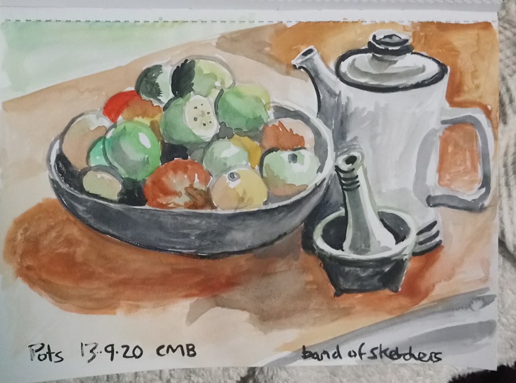 I selected some pots in the kitchen for a quick watercolour sketch before the sun went down. I don’t do watercolours very often, these are Cotman colours which are quite strong. I painted in an A5 cartridge paper sketchbook.