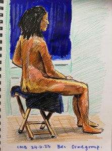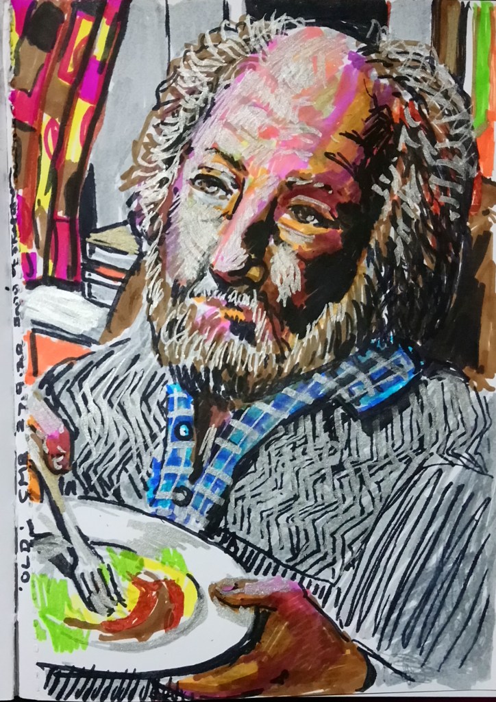 My hubby, forty years together and we are both getting old. Various marker pens on cartridge paper. He didn’t keep still or I would have done a better job on it. I’ve bought a few more permanent marker pens. Some are OK, but some seriously smell of something like acetone? I used a silver pen to try and add grey to his hair and reflections/highlights on his face.