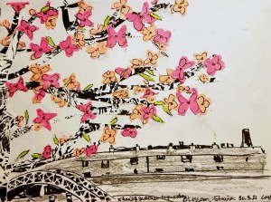 Yesterday’s walk was past trees coming into blossom on the Cauldon arm of the canal. The white bridge over it is in the background. I decided to make a collage if it, post it notes cut up for the blossom and leaves. I used some black monoprint for the tree bark. Then I added black ink and graphite. This was for the #bandofsketchers prompt regeneration. I’m afraid the blossom looks more like butterflies.. But I tried!