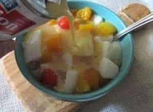 An advert for evaporated (condensed milk). But I’m more interested in the fruit salad portrayed here. That bowl represents at least one whole can of the stuff, I know because me and my sisters used to squabble over it in the 60s and 70s. If there was only one cherry in the tin our mother used to cut it into four. It also has peaches, pears and I think pineapple.