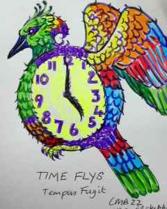 Today’s #bandofsketchers prompt was time. This is based on an idea that I first came up with on my MA. Time flies. I had lots of ideas including a bird, a butterfly and a dragonfly. This is some sort of magical, time travelling bird clock. I don’t think it’s a parrot and it’s very round!