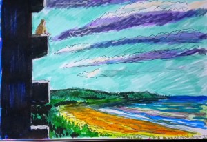 Tuesdays #bandofsketchers prompt was Overlooking. This is an imagined landscape in felt pens. Being in Stoke with a shaking arm means I don’t get to travel much. I want to go to the sea again, and being in an apartment overlooking an ocean view would be a good thing to do.