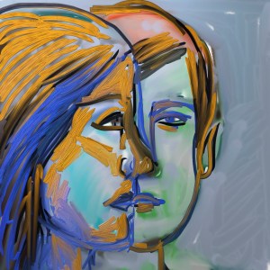 Blue and orange are complementary colours. I thought I would use them to shade this drawing of a profile and straight on face. I like the way the two faces almost merge into one. This is a theme that appears quite frequently in art. It’s also something the band ABBA used when singing! They were not using these colours.