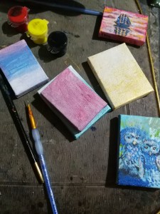 I’m asking for suggestions for small paintings, ideas for new pictures? These will be matchbox sized or slightly bigger. I need to do some paintings of bees on flowers. I painted giraffes against sunsets. I might add some metallic paint again.
