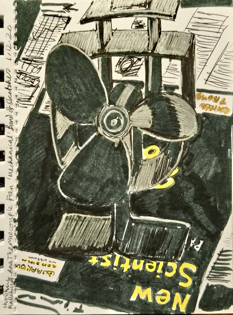 Thermocouple fan sitting on top of the New Scientist magazine. Today’s #bandofsketchers prompt was mechanical and this was the first thing that came to hand….. Heat from a fire is converted via a thermocouple into energy to rotate the fan. It should sit on top of something like a log burner so the base gets hot but hubby has it lying down in front of the halogen heater…. He likes watching it whirl…