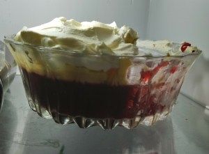 I made this on Sunday, it has jelly with raspberries and port in it. Very soothing for my throat. Its low sugar because I use a bit of sweetner instead of sugar. It’s cool and tasty. Unfortunately I had to use custard (not my favourite), but it went down well.