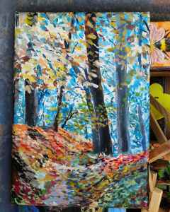 I tried to emphasise the blues in the background to give it a distant feeling. Then I emphasised the reds and greens to ring them to the fore. The leaf litter was fun to paint trying to shape it and add light shining through the leaves onto the ground. It’s a small acrylic on canvas.