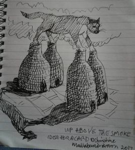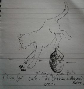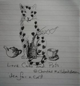 Fond memory of a cat doodle I did eight years ago. This was on my Facebook memories today. There are other drawings but I won’t put them on here. I might use them later but I think this is the cutest one. The little bottle oven and tea set are the connection with where I live, the Potteries, Stoke-on-Trent.