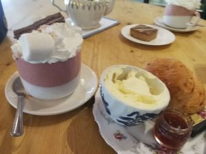 Scone, jam, cream and hot chocolate with massive marshmallows! My treat for getting out of the house with my friend after being stuck indoors for a few days. It was very creamy. An overdose of cholesterol. I liked the willow pattern bowl the xlotted cream was in. The sun was shining and it felt really summery.