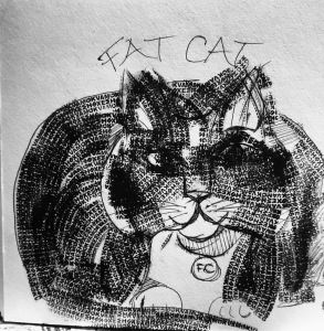 When I got an ink roller to blot out the name and address on a letter I realised I could also draw with it. This is from 4 years ago and came up on Facebook memories. This was one of my experiments. Since the roller made quite a wide mark it turned into a fat cat! Some of it is using a fine line pen but if you use the roller edge you can also draw lines.