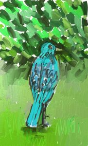 A strange little doodle of a blue coloured bird, just experimental play with the Artrage app. It not exactly exciting, I just wanted to try an get an idea down of what a bird would look like. I’ve got several criticisms, the neck is probably too short, the tail too long and basically the colour is far too bright. It’s like the bird has had a can of paint poured over it! But I’ll call it done.