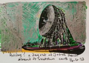 Thursdays #bandofsketchers prompt was holiday. Holiday? What’s that. We usually stay around Stoke because we don’t have many people to cat sit and holidays are too expensive. We do have days out. I tried to draw Jodrell Bank from memory, gave up and drew over it with a silver pen. Vaguely got the detail!